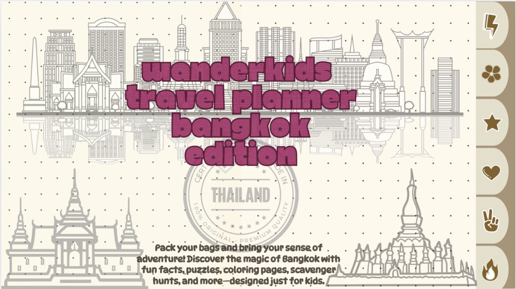 The WanderKids Bangkok Edition is a printable activity book packed with fun facts, local culture, tasty food, and screen-free learning β perfect for kids aged 5β11 whether you're traveling or learning at home.