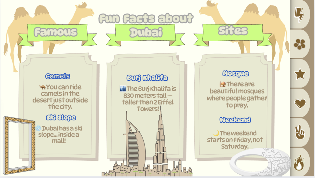 This book is designed to be used before and during your trip to Dubai. Start exploring a few pages at home to build excitement, then bring it along for your travels! Use it in cafes, at landmarks, in transit, or during quiet downtime. Kids can complete activities, color, and learn as they go.