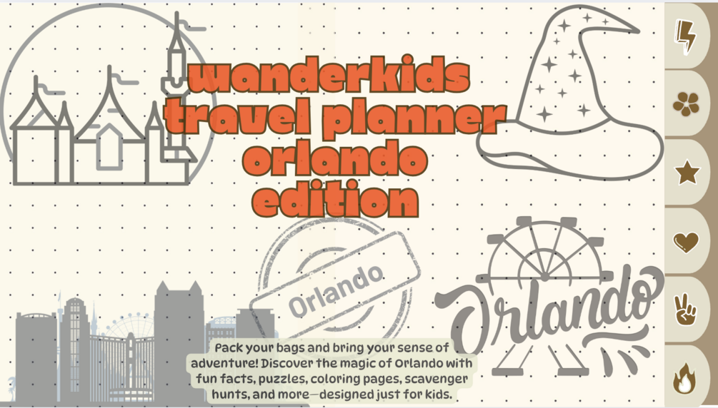 The WanderKids Orlando Travel Planner is a printable activity book designed for kids ages 5β11 who are ready to explore Floridaβs most exciting city! From theme parks to gators, sunshine to space shuttles β this planner helps young travelers stay curious, engaged, and entertained on the go.