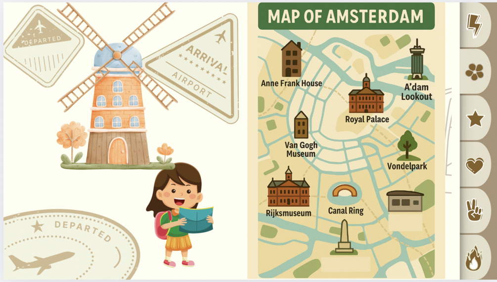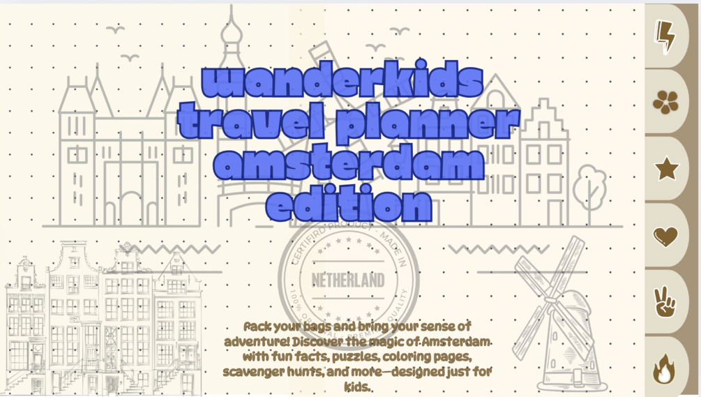 Get ready to explore the colorful canals, bikes, and sweet stroopwafels of the Netherlands with the WanderKids Amsterdam Edition — a printable travel planner and activity book designed especially for kids aged 5–11.